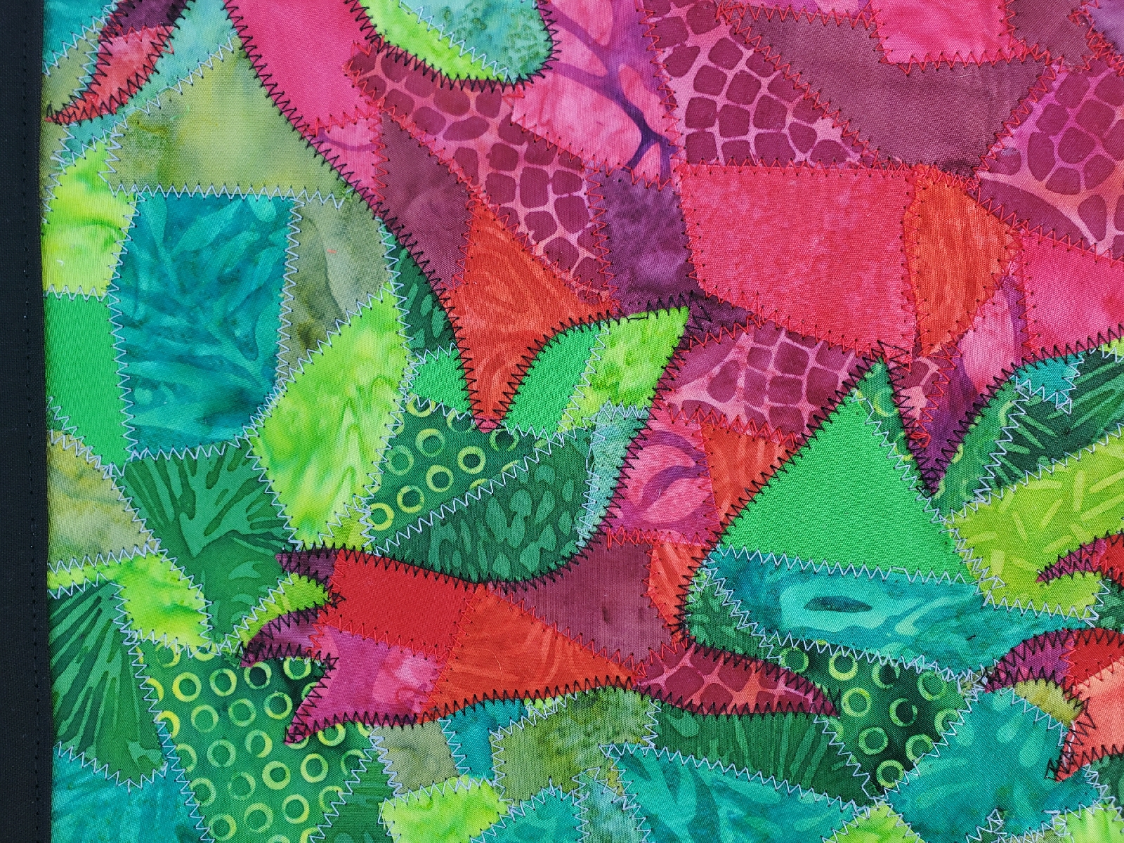 I used a myriad of Island Batik scraps from many different collections, as well as Aurifil thread and Schmetz microtex needles to create this collage quilt. It's 16.5" x 21" and will hang on the wall in our living room.